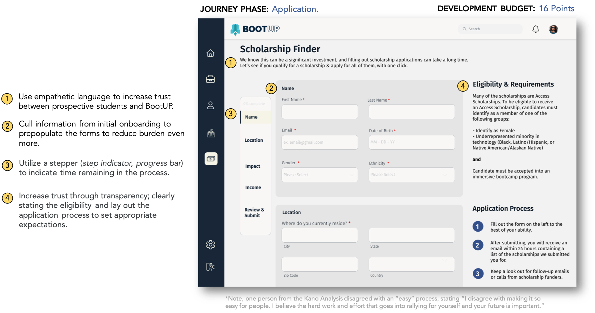 RATIONALE: BootUP wants to help more marginalized folks make the transition into tech and increase economic mobility. Providing an easier solution to connect prospective students to available money can provide opportunities for the target demographic. Rated as “Attractive” in Kano Analysis (i.e. Likes having a feature that is not expected).