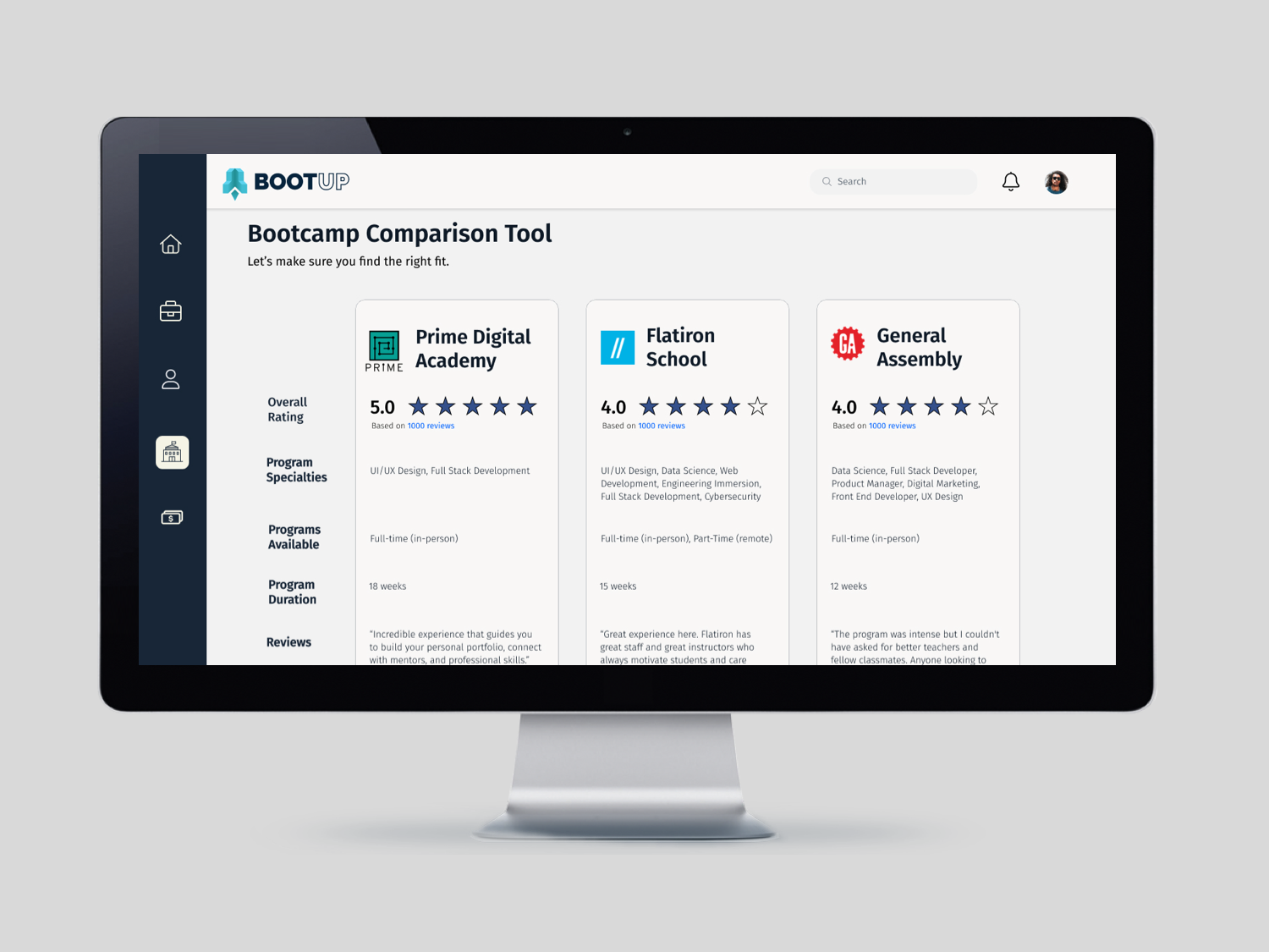 GOAL: An easy, one stop shop that details the stark differences between bootcampprogram offerings to help prospective students determine what they want and make the most informed decision.