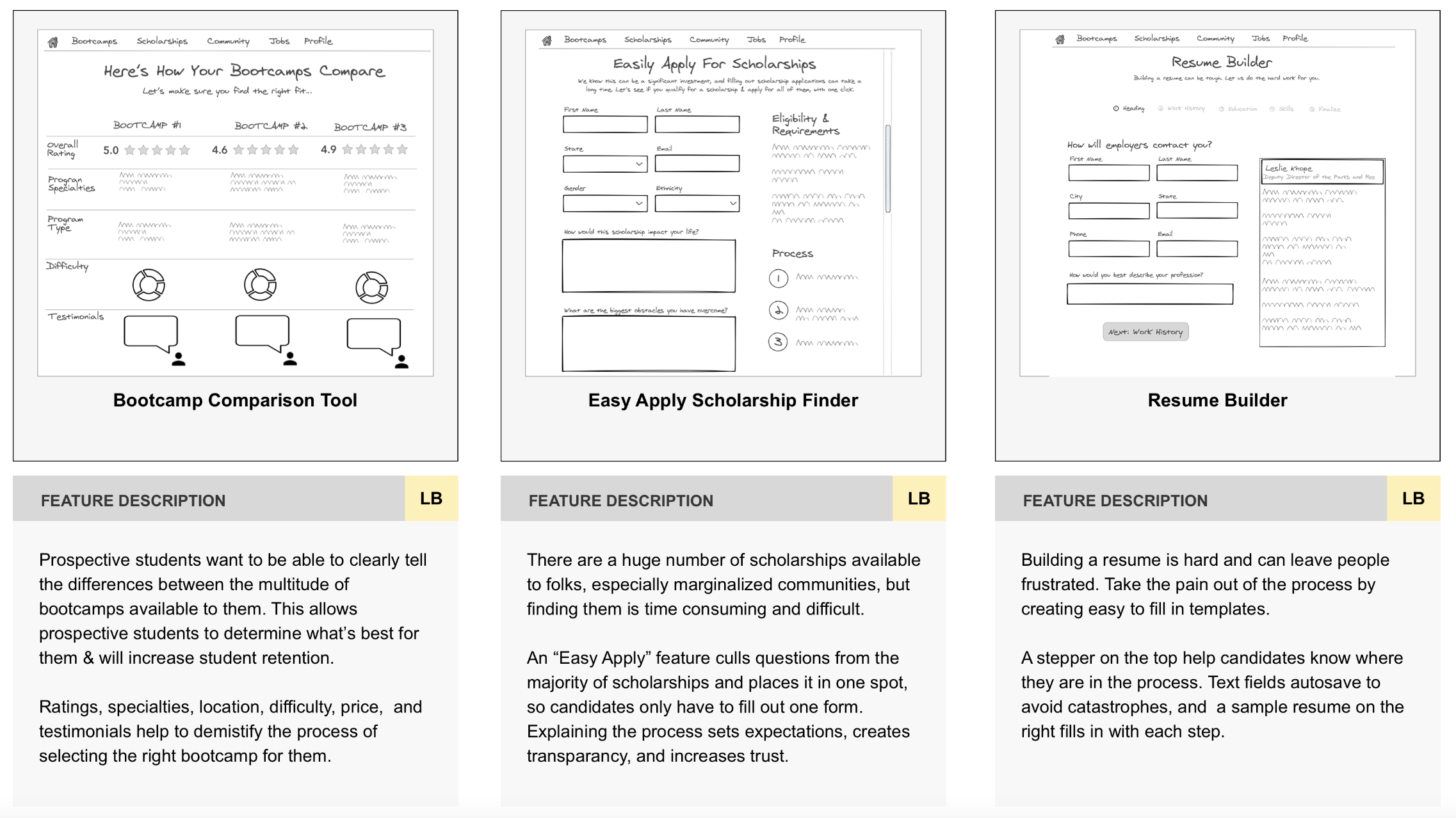 After meeting with the stakeholders and conducting a kano analysis, I decided to focus on the largest gaps for prospective students in the current website experience— exploration, application, in-program and job search. For Exploration, I created a Bootcamp Comparison Tool— a quick scannable table that shows prospective students the most important information and allows them to make an informed choice. For Application, I created a Scholarship Finder— an easy solution to connect prospective students to available money and provide opportunities for their target demographic. For In Program, I created a Resume Builder— a standardized tool for candidates that reduces the burden of creating their first resume And for Job Search, I designed a Company Profile Page— a one stop shop where curious candidates can find reviews from fellow BootUP users, location, and BootUP alumni currently employed there.