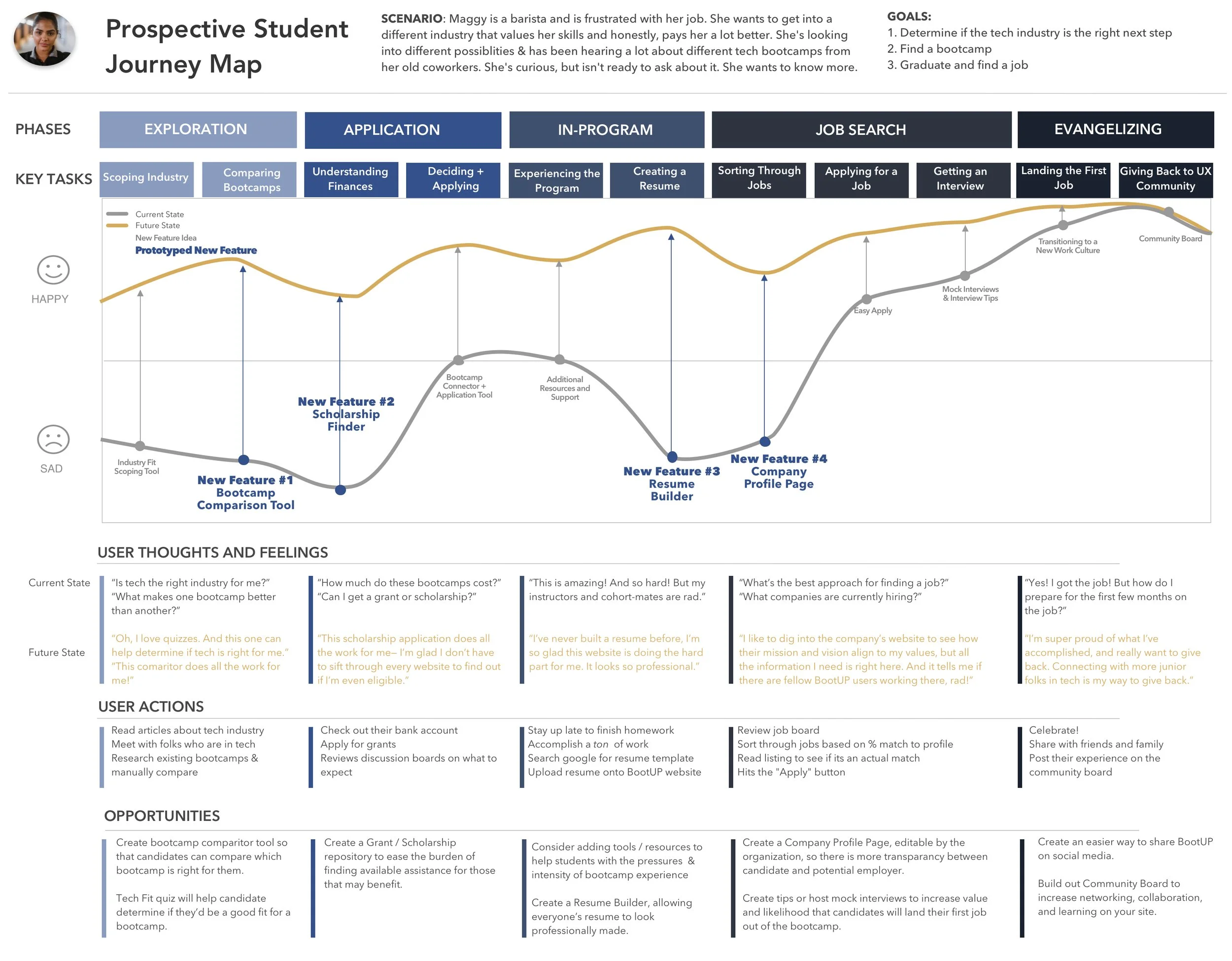 Due to time constraints we were unable to do observational or primary research directly with that user set, so the stakeholder meeting and competitive analysis were used to inform a journey map for a prospective student. For this example, I created a scenario for Maggy, a frustrated barista who’s heard that tech might be a good career switch, but has some reservations.