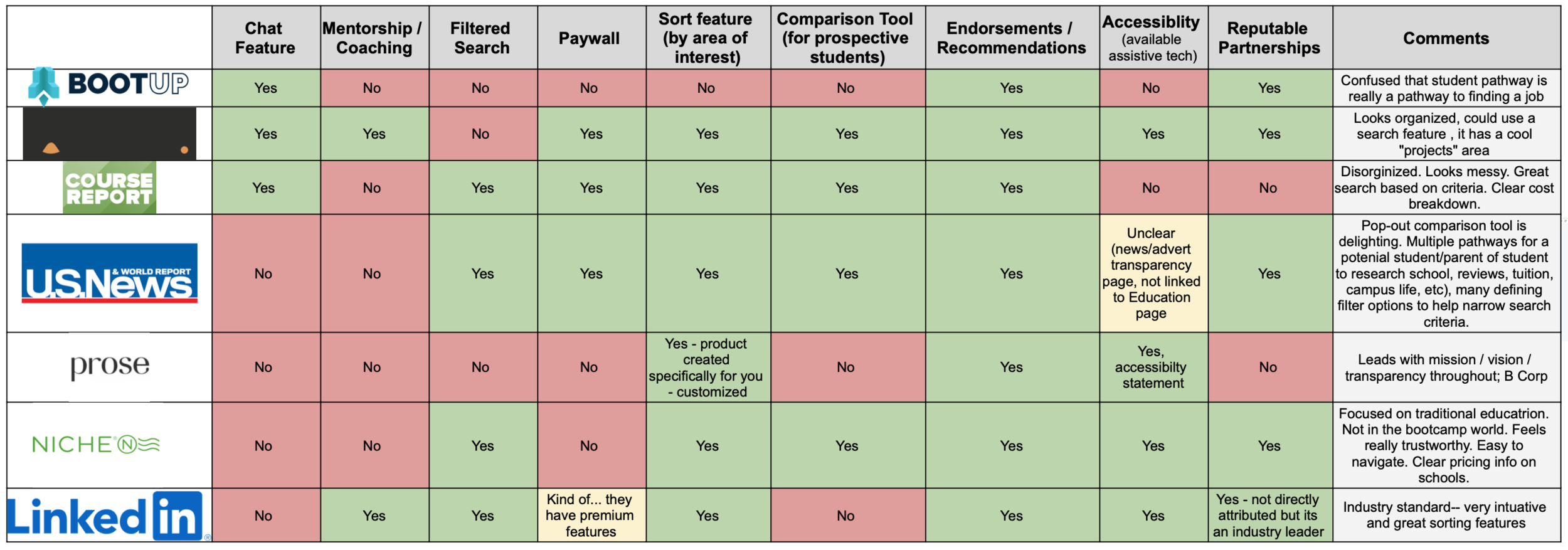To inform ourselves with the expectations that users may bring to their BootUP experience, my team and I conducted a competitive audit, looking at the competitive landscape for bootcamp finders, job placement tools, and resume builders. We each took a pass at identifying key features on each website, then used affinity diagramming to come up with our comparison criteria. Going a few steps further on the spheres of influence, we also looked at websites that had highly rated onboarding experiences to understand possible new feature delighters. Interestingly, we weren’t able to identify a site that was walking a prospective student through their entire journey into tech, affirming that could be a major differentiator for the client.