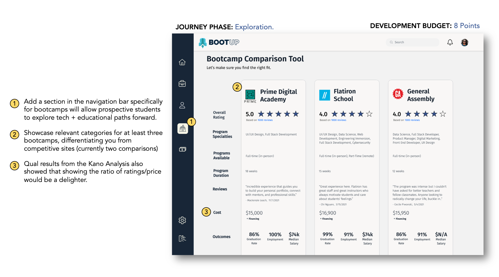 RATIONALE: Currently, there are no options for prospective students on the BootUPwebsite. Providing a comparator tool, similar to Career Karma, would decrease frustration & confusion when looking for a school. It also translates into helping bootcamps increase enrollment for the right candidates. Rated as “Attractive” in Kano Analysis (i.e. Likes having a feature that is not expected).