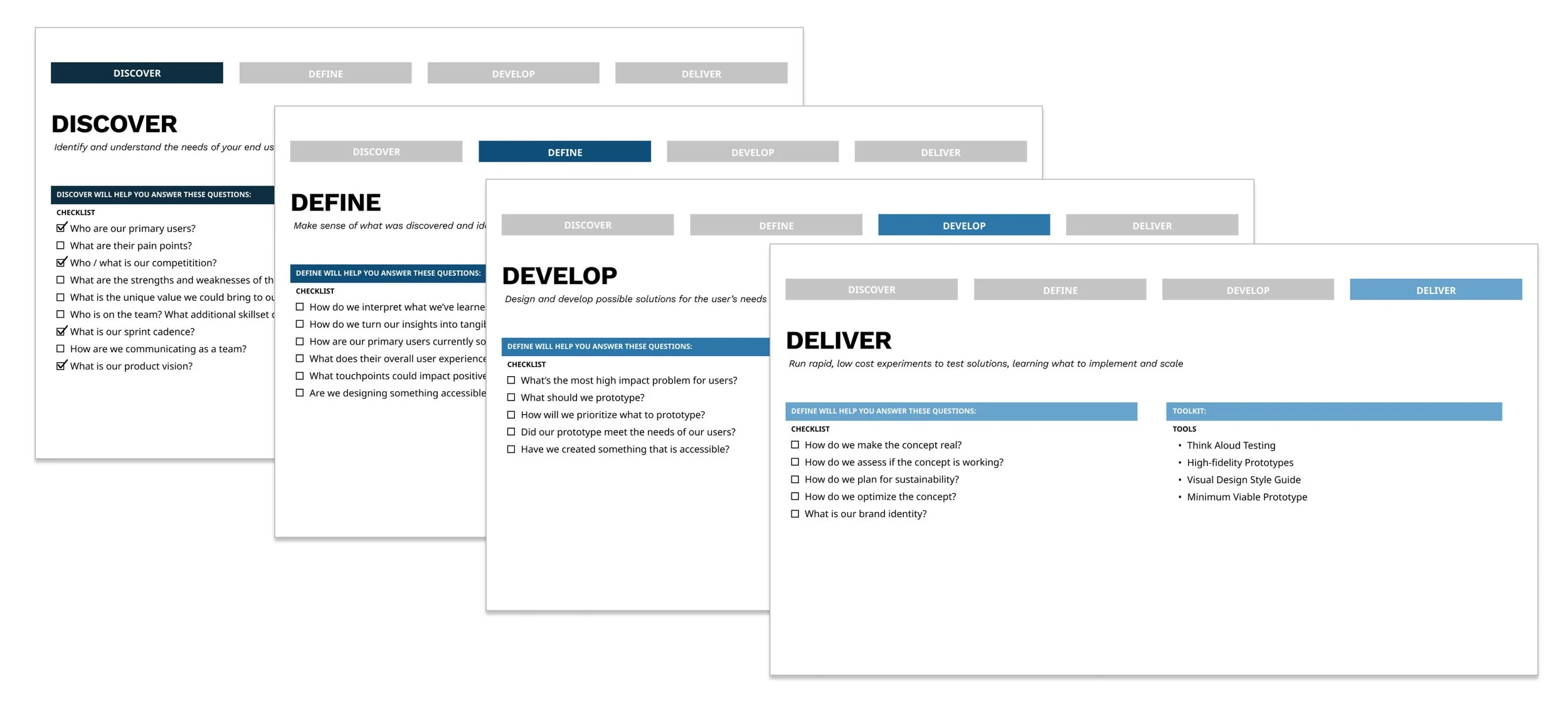 With this in mind, I created a playbook based off of the double diamond framework that defines a user-centered approach for future work. Knowing that resources may be scarce in the early phases of Digital SEA, I wanted to create an approach that her future team could use to efficiently move through the design process while still keeping the primary users at the center of each decision. I created a framework and phased approach for future design sprints that articulated the goals, methods, and outcomes specific to Digital SEA’s product. Utilizing this framework will allow Brittany's future team to embrace complexity while aligning and prioritizing future work.