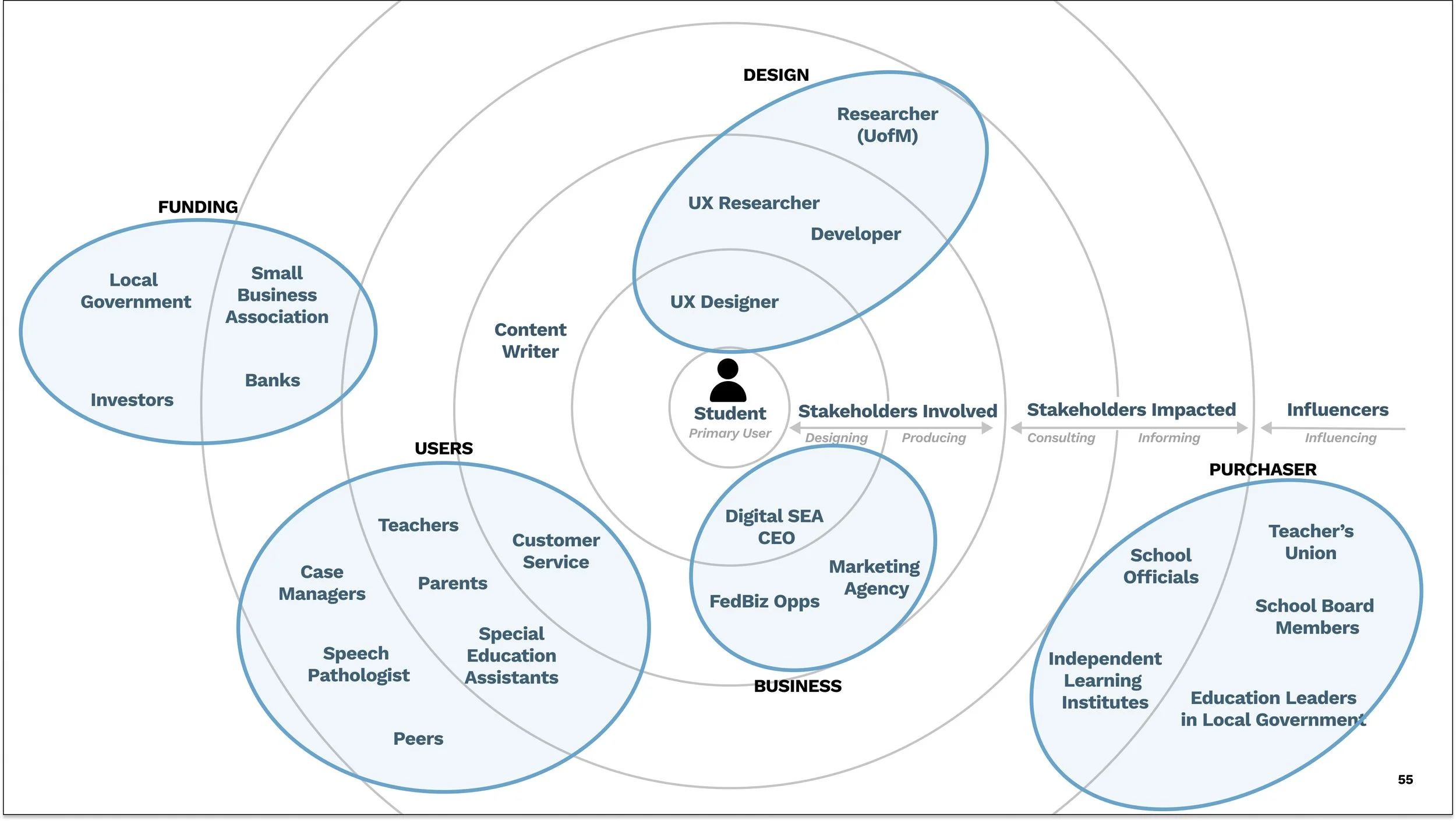 To understand the stakeholders, I pulled insights from Brittany’s early discovery work as well as secondary research of my own. Starting with a whiteboard and Post-it Notes, I started to visualize a system that articulated the relationship between stakeholders, starting with the student at the center.